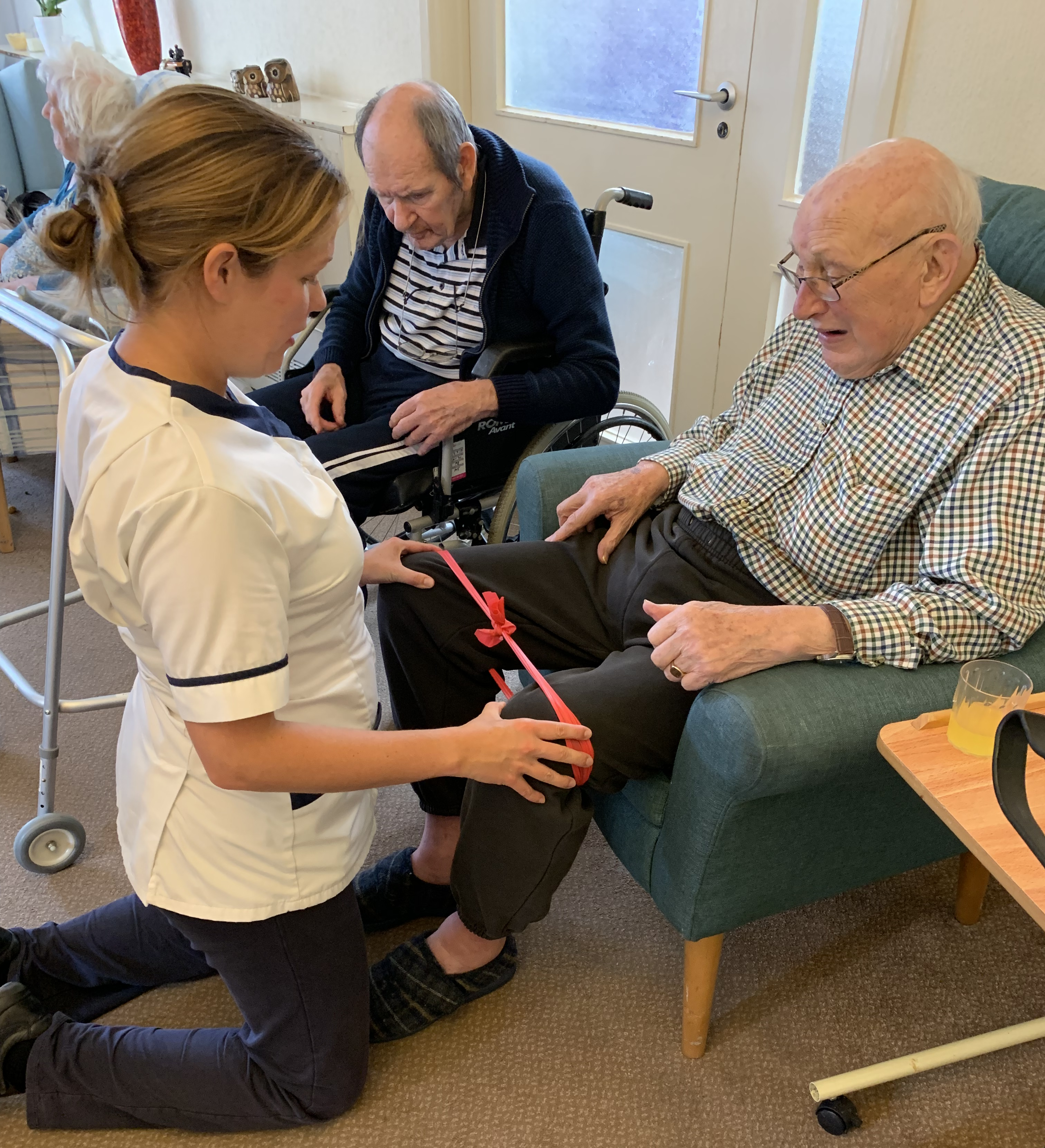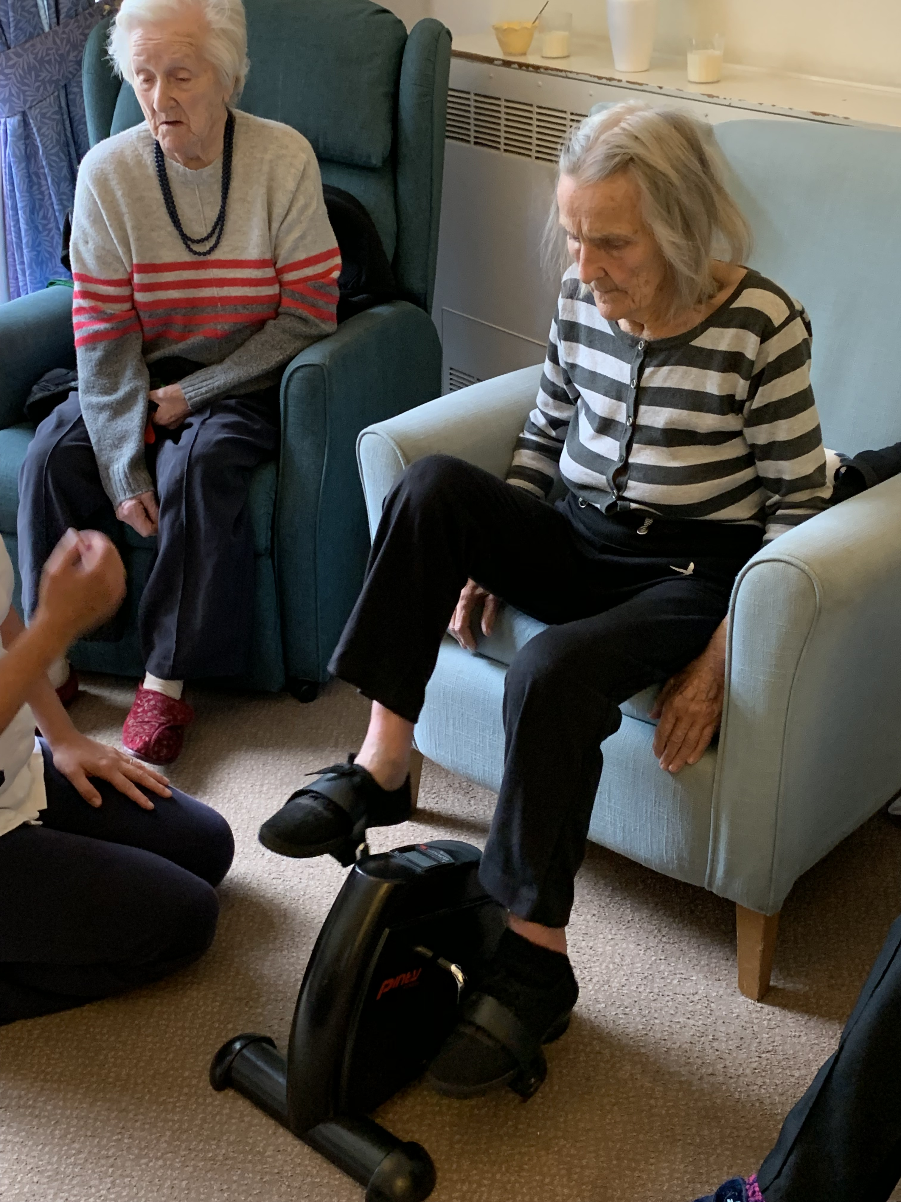 I recently teamed up with two local physios, Naomi and Alahna, to host an exercise, balance and safety session for some of the residents at Queensmead Care Home. When we arrived we were introduced to Lesley, the Activities Coordinator and shown to a living room where eight residents were sitting. It was just after lunch when we arrived and quite a few of the group were asleep, so before we introduced ourselves we had to gently wake them. We managed to get the full attention of six residents, who were all happy to participate in the session. We each introduced ourselves and explained our working roles.