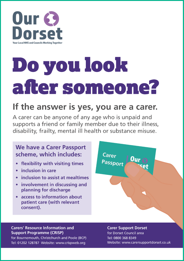 Last year hospitals across Dorset launched a new Hospital Carer Passport to help carers be recognised and supported while they are caring for someone who is in hospital. The Carer Passport scheme generally includes the following, though each hospital’s offer may differ: