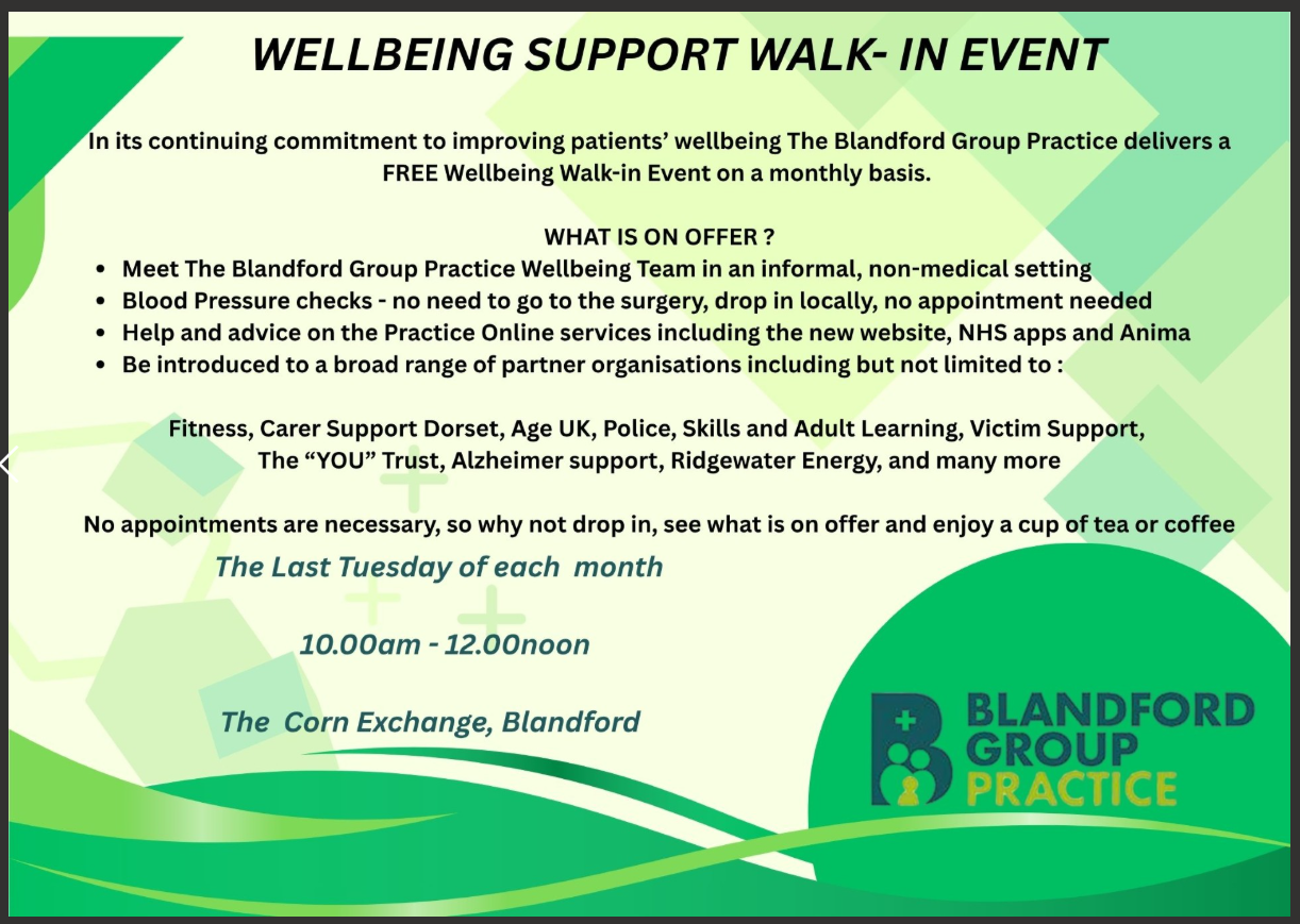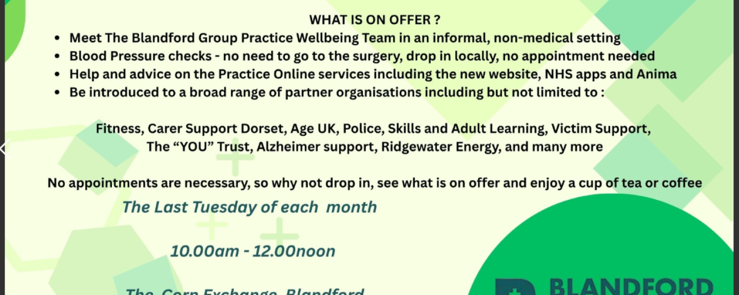 We will be at The Corn Exchange, in Blandford on the last Tuesday of every month, with The Blandford Group Practice in its continuing commitment to improving patients' wellbeing. Come and meet us.